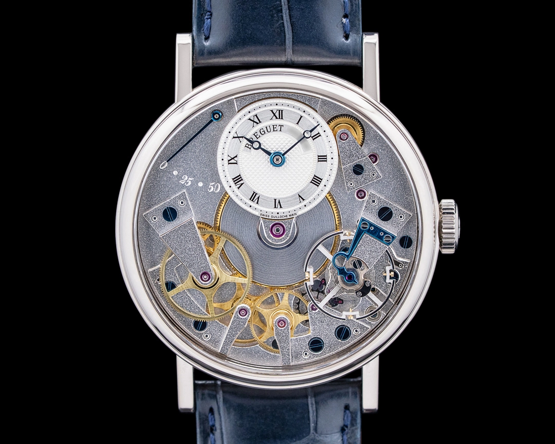 Breguet 7027BB Tradition Manual Wind 18K White Gold Black Skeleton Dial. It’s an extremely elegant watch design that tastefully showcases the beauty of mechanical movement.