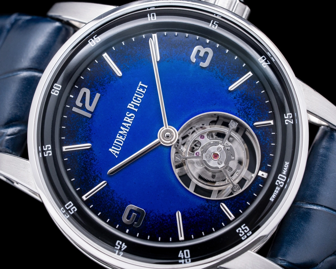 You know what they say - two tourbillions in one article are better than one. This example from Audemars Piguet’s Code 11.59 collection has the signature design details that make the 11.59 so interesting, such as its unique sapphire crystal, round outer case, octagonal midcase, and curved lugs. The real eye-catcher here is the saturated cobalt blue fume dial with a flying tourbillon at the 6 o’clock position, powered by the in-house automatic caliber 2950 movement that’s visible through the sapphire caseback. The case, hands, applied dial markers, and deployant buckle white gold, providing a bright contrast against the deep black lacquer on the outer bezel. The dial and the flying tourbillon alone are sure to keep you staring at your wrist.
