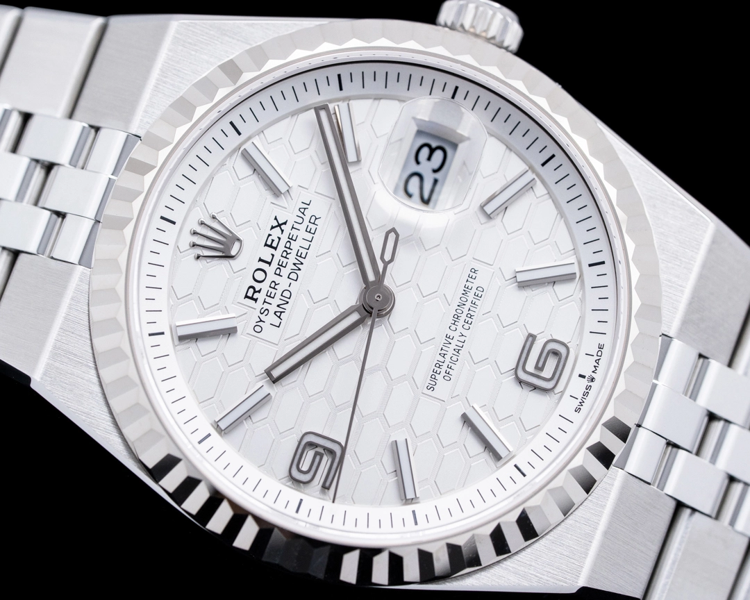 The reference 127234 featured here comes sporting a lovely white dial flaunting the collection’s signature honeycomb motif with explorer indices and a lumed handset. A cyclops-topped date window calls back to one of Rolex’s signature details, and the fluted bezel references many of Rolex’s other popular collections. There’s a lot that’s new here, from the integrated bracelet’s flat link jubilee design to the dial finish and layout. A slender profile of 9.7mm allows the watch to wear far more comfortably than many integrated bracelet watches.