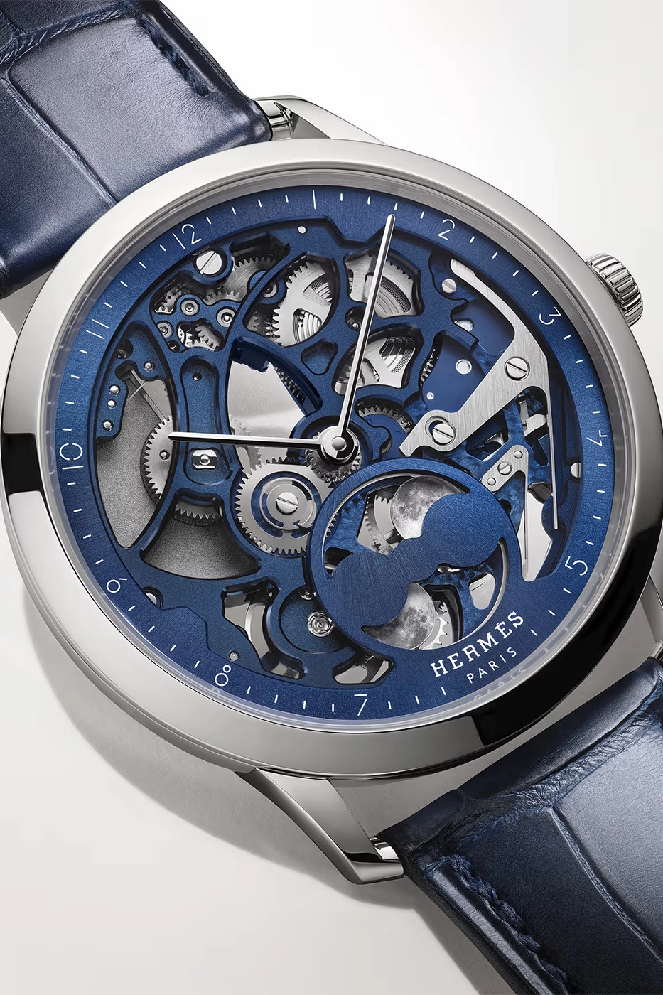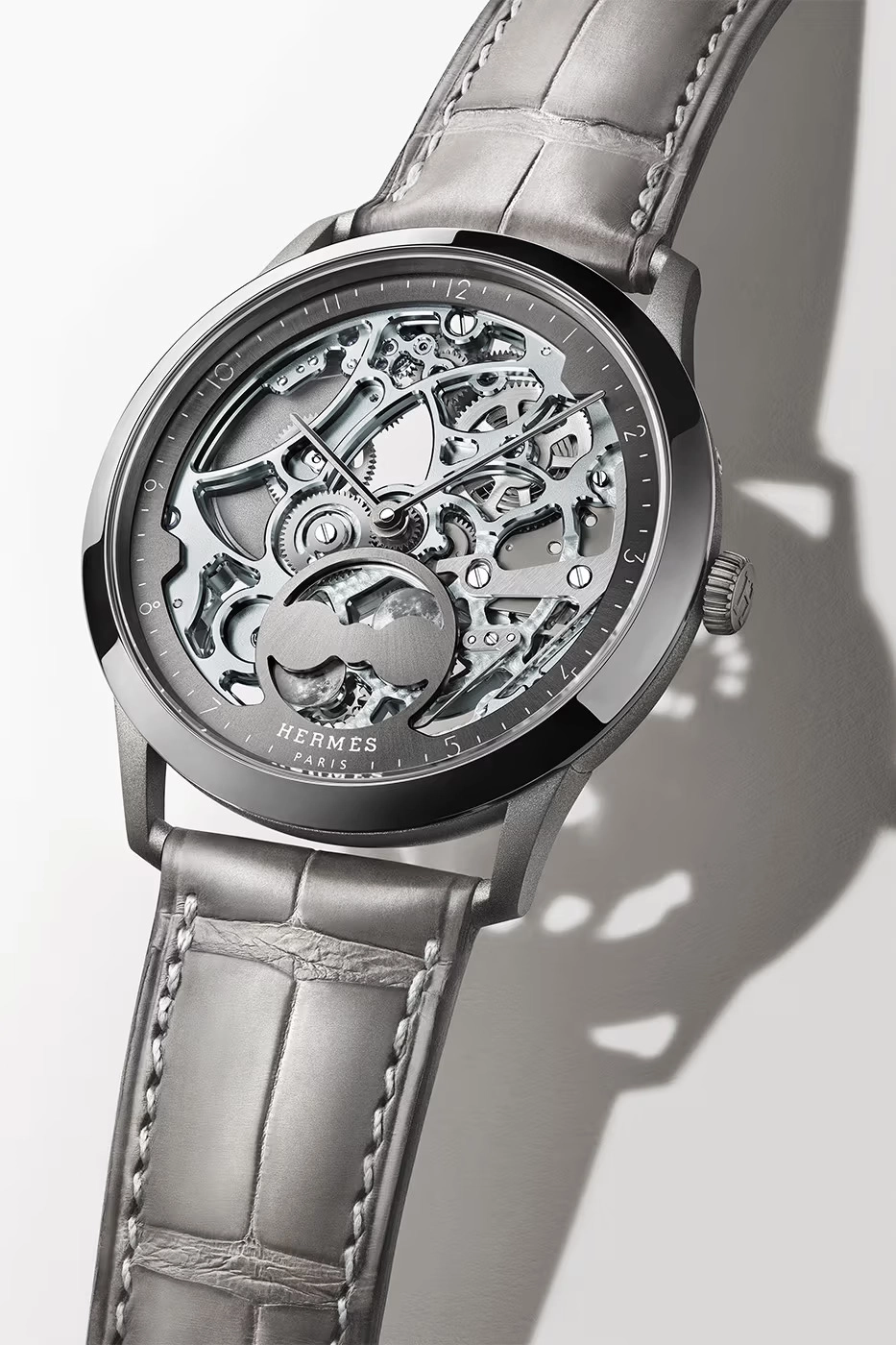 Hermès presented the latest in its Slim d’Hermès line with the Squelette Lune in two case metal options: titanium and platinum. Both models feature openworked views into the Slim d’Hermès movement architecture, visible on both the dial side and through the exhibition caseback, where the viewer can enjoy the micro-rotor. Both cases are 39.5mm in diameter and live up to the Slim moniker at 8.8mm thick, and both feature a rotating moonphase display at the 6 o’clock position that is very similar to the moonphase display on the brand’s Arceau L’Heure de La Lune. The colors and metal treatments on each version are very different, however, with the platinum version in a classic and high-contrast combination of blues and grays in a polished case and dark blue strap, and the titanium version in a more subtle combination of greys and soft green with a mix of bead-blasting on the case and a polished bezel with a gray strap.