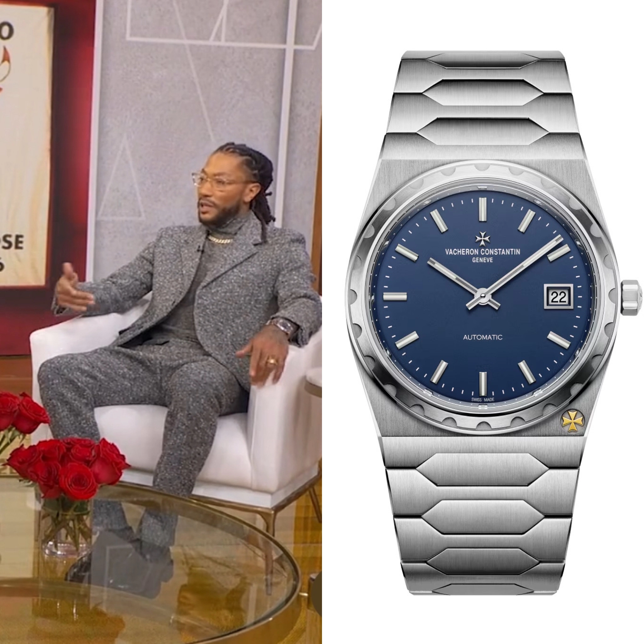 Derrick Rose appeared on Good Morning America speaking about the Bulls retiring his jersey wearing a Vacheron Constantin 222 in steel.