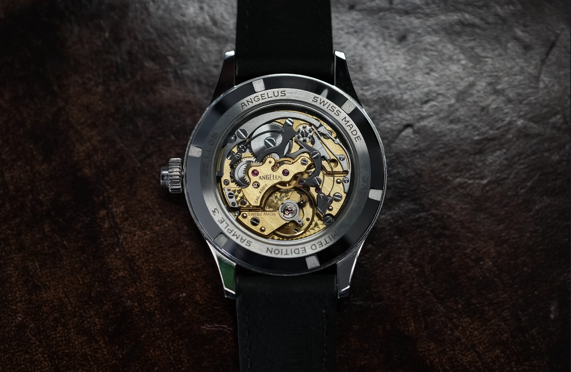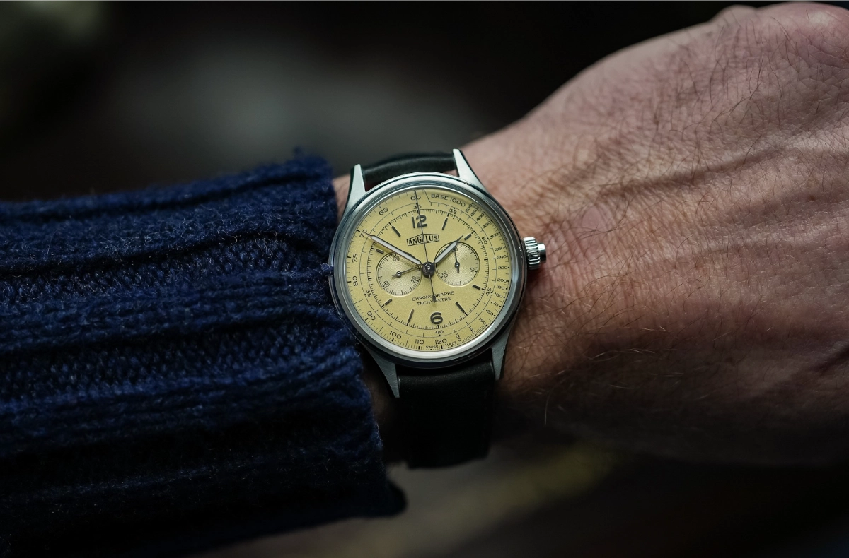 Monochrome continued its Montre de Souscription editions with its fifth collaboration, the Angelus Chronographe Tachymètre. The vintage-inspired piece combines classic chronograph design with a modern monopusher chronograph movement, the manually-wound Angelus Calibre A5000, which oscillates at a frequency of 21,600 vph and has a 42 hour power reserve. The movement is finished with multiple graining patterns and Geneva striping, and the gold-finished mainplate and bridges contrasting with the steel chronograph mechanism give a pleasing contrast when gazing at the movement through the exhibition caseback.