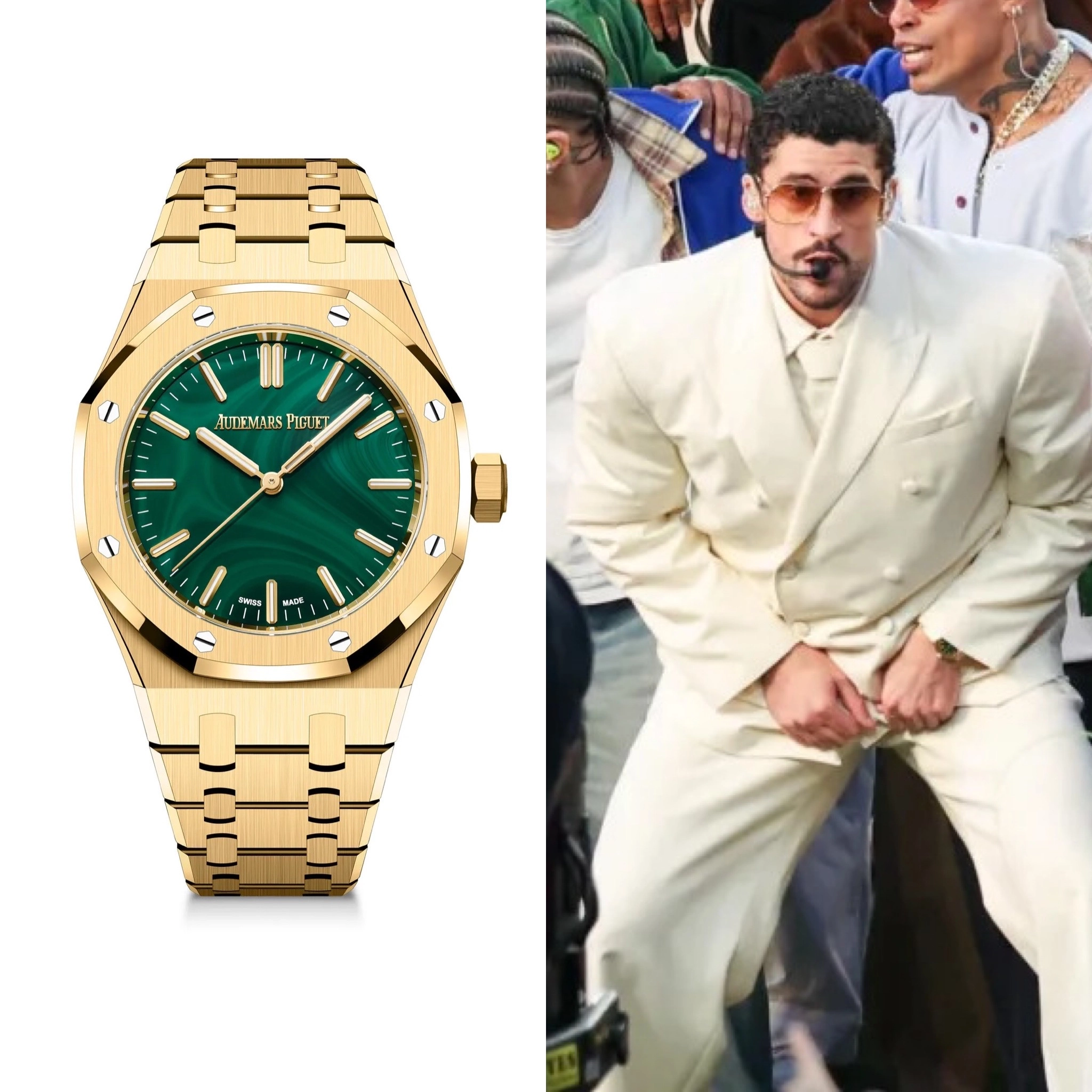 Halftime show star Bad Bunny sported a new Audemars Piguet Royal Oak with a vibrant malachite dial that echoed the green of the field and the sugarcane grass used in the halftime performance.