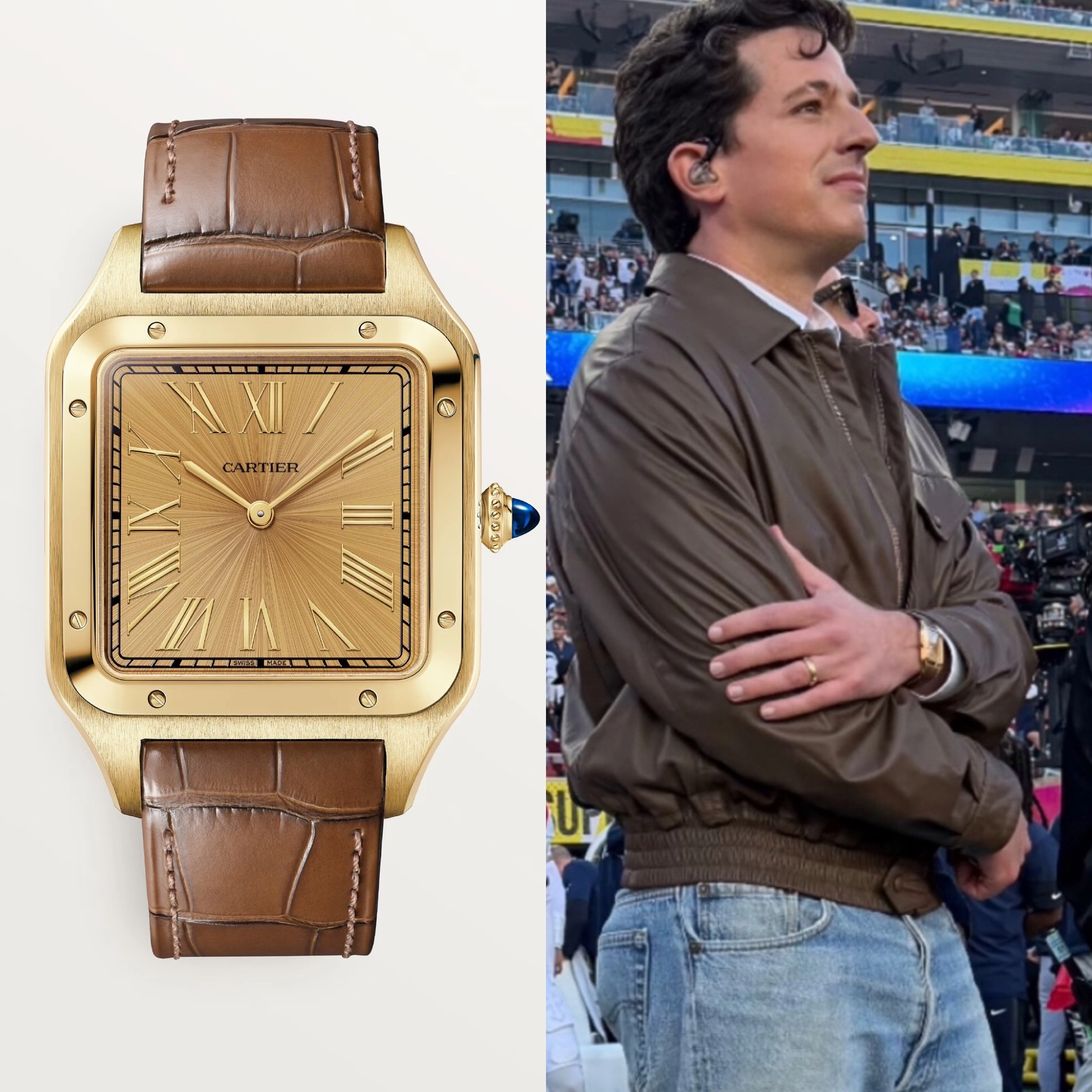 Charlie Puth, who sang the US National Anthem prior to the game’s start, wore a Cartier Santos-Dumont in yellow gold.