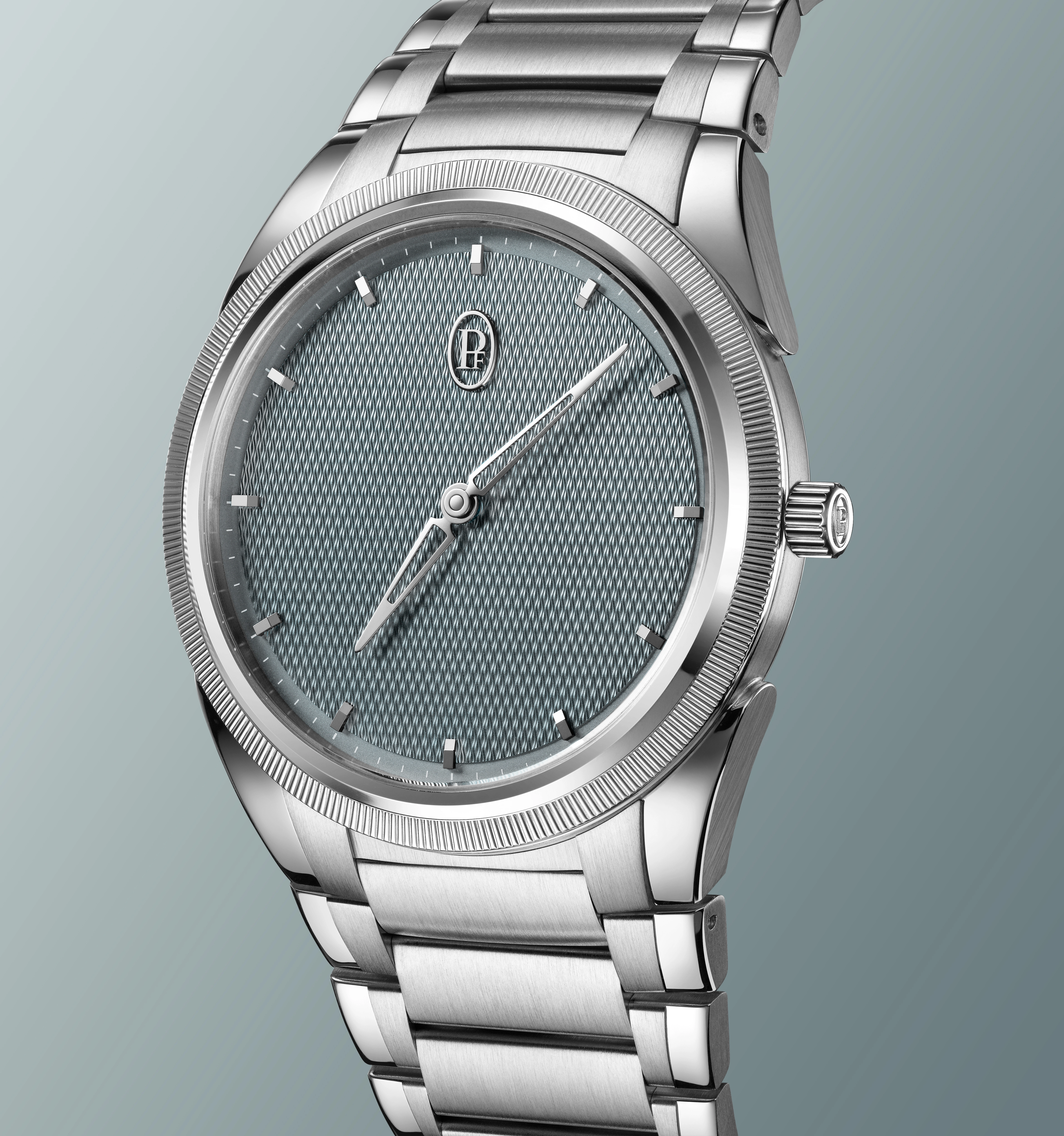Parmigiani Fleurier introduced a new version of its Tonda PF Micro-Rotor with a new Agave Blue dial, in two different case materials: Stainless Steel and Rose Gold. The hand-guilloché dial pattern is rendered in an interesting dial shade that can skew green, blue, or grey, depending on the light. Both versions are in a 40mm case with a bracelet that matches its case material, and they’re both powered by the brand’s in-house automatic PF703 micro-rotor movement.